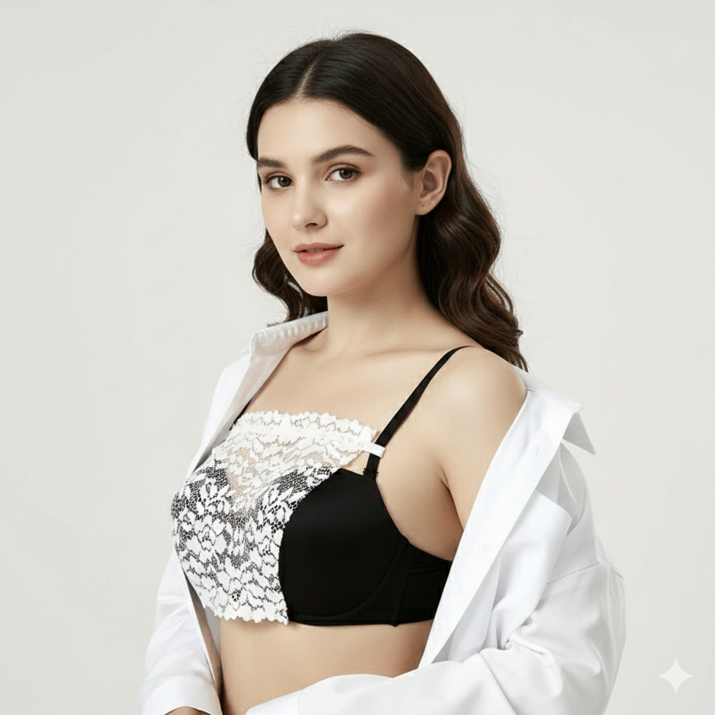 Nosso tapa decote é confeccionado em renda delicada (90% poliamida e 10% elastano), oferecendo um toque suave, ajuste confortável e um visual elegante.